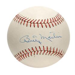 Official Rawlings American League baseball signed in blue ballpoint on the sweetspot “Billy Martin.” In fine condition, with a couple spots of toning.