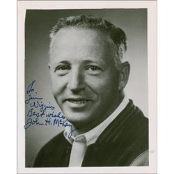 Two items: unique 13.5 x 9.5 football play drawn on a piece of off-white fabric and signed in black felt tip “John H. McKay 1978”; and a glossy 4 x 5