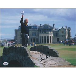 Satin-finish 11 x 14 photo of Palmer proudly displaying his British Open trophy, signed in black felt tip. In fine condition, with a PSA/DNA authentic