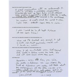 Questionnaire filled out by Goodall and signed at the conclusion, one page, 8.5 x 11, January 13, 2013. Goodall comments on her legacy, accomplishment