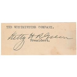 Businesswoman (1834–1916) known for being the first American woman to make a substantial impact on Wall Street. Ink signature, “Hetty H R Green,” on a