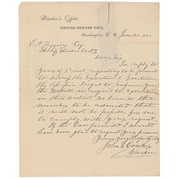 Rare ALS signed “John S. Crocker, Warden,” one page, 8 x 9.75, Warden’s Office, United States Jail letterhead, June 20, 1882. Letter to E. P. Higgins,