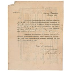 Scarce DS, signed “A. Hamilton,” one page, 7.25 x 9, August 31, 1792. Printed Treasury Department circular. In part: “Agreeably to an order of the Sen