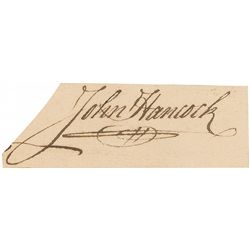 Instantly recognizable ink signature, “John Hancock,” on an off-white 3.75 x 1.25 slip. Slip is affixed to a 6.25 x 4.5 off-white sheet, with a small