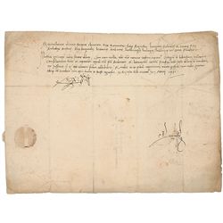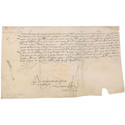 King of France (born 1553), the first of the Bourbon line, who ruled from 1589 until he was assassinated in 1610. Manuscript LS in French signed “Your