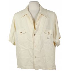 Hughes’s personally-owned and -worn shirt. Off-white short-sleeve shirt features a button-up front, and is monogrammed “H. H.” on the left breast pock
