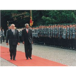 Color glossy 9.25 x 7 photo of Mandela with President Roman Herzog of Germany in 1996, signed in gold ink, “N. Mandela, 13.7.2001.” In fine condition,