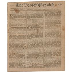 Original complete edition of The Boston Chronicle, 8.5 x 10.5, eight pages, dated November 7–14, 1768. Paper has reports of the Cherokees, Creeks, and
