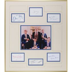 Color satin-finish 20 x 16 photo of the cast with their famous cars, signed in black felt tip by Tom Wopat, John Schneider, Catherine Bach, Sonny Shro