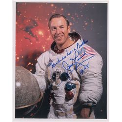 Official color 8 x 10 NASA lithograph of Swigert in a suit and tie posing with a model of a lunar lander, signed and inscribed in black felt tip, “To
