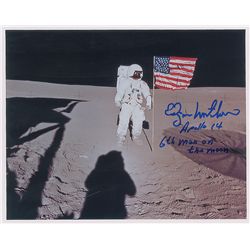 Color satin-finish 10 x 8 photo of Mitchell standing next to the American flag on the lunar surface, signed in blue felt tip, “Edgar Mitchell, Apollo