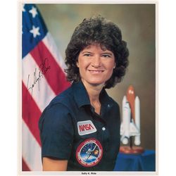 Two items: official color 8 x 10 NASA lithograph of Ride, signed in black felt tip; and a hardcover copy of The Mystery of Mars, signed on the first f