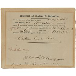 Partly-printed DS, signed “Nath. Hawthorne,” one page, 8.5 x 7, May 6, 1848. Document stating duties have been secured on eighteen cords of wood broug