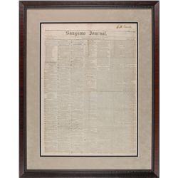 Original issue of the December 23, 1837, edition of the Sangamo Journal, four pages, 18 x 24.75, with a notice in the first column reading: “Stuart ...