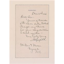 Choice LS signed as president-elect, “J. A. Garfield,” one page, lightly-lined, 5 x 8, Mentor, Ohio letterhead, December 2, 1880. Letter to George F.