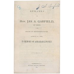 Garfield’s personally-owned pamphlet containing his brief speech, “Remarks of Hon. Jas. A. Garfield, of Ohio, in the House of Representatives, April 1