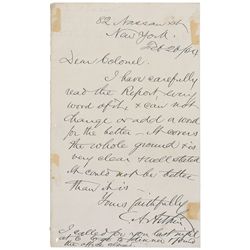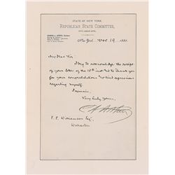 LS signed as vice president-elect, “C. A. Arthur,” one page, 5.5 x 8.25, New York Republican State Committee letterhead, November 19, 1880. Letter to