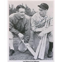 Interesting 6.25 x 8.25 cardstock photo of DiMaggio kneeling on the field with Lou Gehrig, signed in black felt tip, “Best Wishes, Joe DiMaggio.” In f