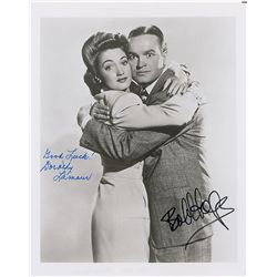 Glossy 8 x 10 photo of the pair hugging each other, signed in black felt tip, “Bob Hope” and in blue felt tip, “Good luck! Dorothy Lamour.” In fine co