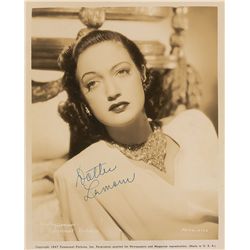 Vintage glossy 8 x 10 Paramount Pictures publicity photo of Lamour, signed in fountain pen, “Dottie Lamour.” Scattered surface creases and cracks to e