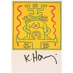 Color 4 x 5.75 postcard of one of Haring’s typical works, signed in the lower border in black felt tip. In fine condition, with slight haloing to sign