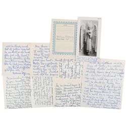 Collection of six items, including four ALSs, a signed photo of an angelic statue, and a ballpoint signature on a calendar page. The letters span 1958