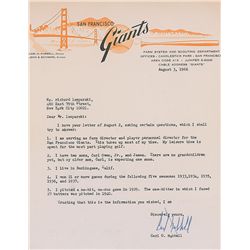 TLS, one page, 7.5 x 10, attractive San Francisco Giants letterhead, August 3, 1966. Letter to an inquisitive admirer. In part: “I am serving as farm