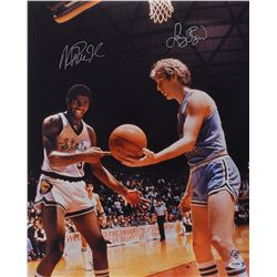 Color satin-finish 16 x 20 photo of the two from their memorable 1979 NCAA championship game, signed in silver ink by both Bird and Johnson. In fine c