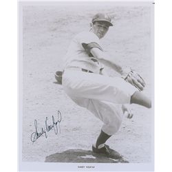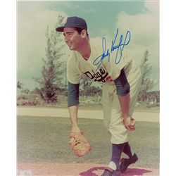 Desirable color glossy 8 x 10 photo of Koufax in his Brooklyn Dodgers uniform, nicely signed in blue felt tip. In fine condition.