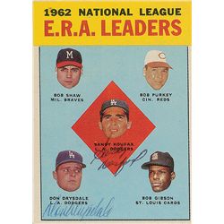 Desirable 1963 Topps #5 baseball card depicting the previous season’s National League ERA leaders, signed in blue ballpoint by Dodgers teammates Sandy