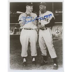 Glossy 8 x 10 photo of New York’s greatest center fielders side by side, signed in blue felt tip by both Mickey Mantle and Willie Mays. In fine condit