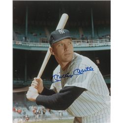 Color glossy 8 x 10 photo of Mantle in his batting stance, signed in blue felt tip. In fine condition, with a trivial chip to the upper left corner ti