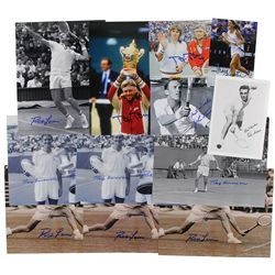 Collection of 12 signed photos, various sizes and finishes, each signed by a tennis great. Signers are: Rod Laver (4), Roy Emerson, Vic Seixas, Bjorn