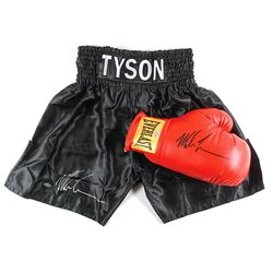 Two items: red leather Everlast right-hand boxing glove, signed across the top in black felt tip; and a pair of black boxing trunks, signed on the fro
