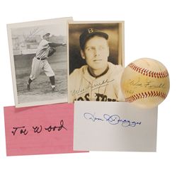 Collection of five items, each signed by a Red Sox player, including: Dom DiMaggio (signature), Joe Wood (signature), Larry Gardner (SP), and Wes Ferr