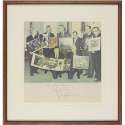 Vintage glossy 10 x 8 press photo of Kennedy at his desk in the Oval Office, ceremonial pens at his side, surrounded by a throng of politicians, signe