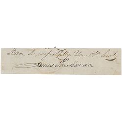 Ink signature, “James Buchanan,” on an off-white 5 x 1 slip, clipped from the closing of an LS. Slip is affixed to an identical size card. In fine con