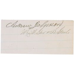 Ink signature, “Andrew Johnson,” on an off-white 3.75 x 1.75 lightly-lined slip, clipped from the closing of a letter, with “Milt. Go. & B. Genl...