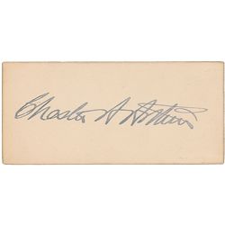Very nice ink signature, “Chester A. Arthur,” on an off-white 3.75 x 1.75 card. In fine condition, with a uniform shade of light toning.