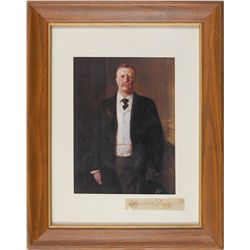 Ink signature, “Theodore Roosevelt,” on an off-white 3.5 x .5 slip clipped from a check. Affixed to a mat and framed with a color portrait of Roosevel