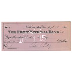 Crisp bank check, 6.5 x 2.75, filled out and signed by Coolidge, payable to himself for $50, September 29, 1915, also endorsed on the reverse. In fine