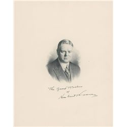 Uncommon 11 x 14 engraved portrait of Hoover, signed below the vignette in fountain pen, “The good wishes of Herbert Hoover.” In fine condition.