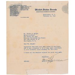 TLS, one page, 7 x 8.25, United States Senate letterhead, February 14, 1940. Letter to Gordon Knight at the National University Law School. In full: “