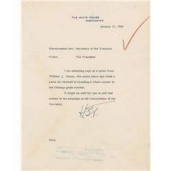 TLS signed “H. S. T.,” one page, 8 x 10.5, White House letterhead, January 15, 1948. Memo sent to the secretary of the treasury. In full: “I am attach