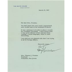 TLS as president, one page, 7 x 9, White House letterhead, March 25, 1947. Letter to former first lady Frances Cleveland (Mrs. Thomas Preston, since r