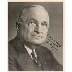 Matte-finish 8 x 10 head-and-shoulders photo of Truman in a handsome suit and tie, boldly signed and inscribed in fountain pen, “To Norman Stamp, Jr.,