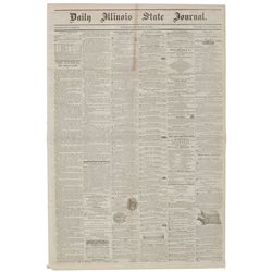 Original and complete July 28, 1858, issue of the Daily Illinois State Journal, 16 x 24, four pages. Below the fold on the front page is an advertisem