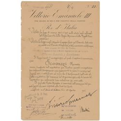 DS in Italian, signed “Mussolini,” one page, 9.5 x 14.5, April 18, 1929. Untranslated decree, boldly signed at the conclusion. In fine condition, with