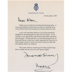 Two TLSs: one signed “Yours most sincerely, Charles,” one page, Sandringham House letterhead, December 5, 2007, about a charity event for the Actors’