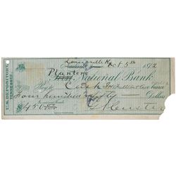 Exceedingly scarce First National Bank check, altered in Custer’s hand to become a Planters National Bank check, 8 x 3, filled out and signed by Custe